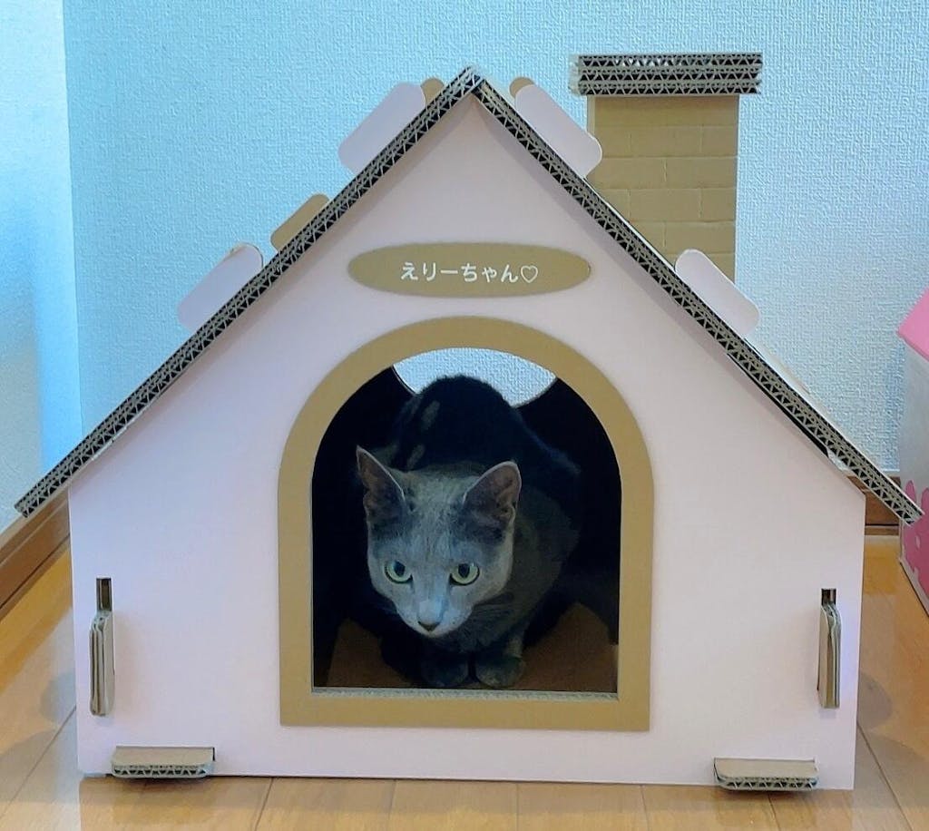 煙突や屋根の穴、窓を使って遊んであげれば、猫ちゃんも大喜び! 穴からのぞく猫ちゃんのかわいい手や鼻先がたまりません♪オプション料金 1,100円(税込)で、おうちの入り口部分に10文字以内の名入れが可能です。プレートの長さは、文字数によって長短2種類ご用意しています。とってもかわいい、猫ちゃん専用のおうちができますよ♪