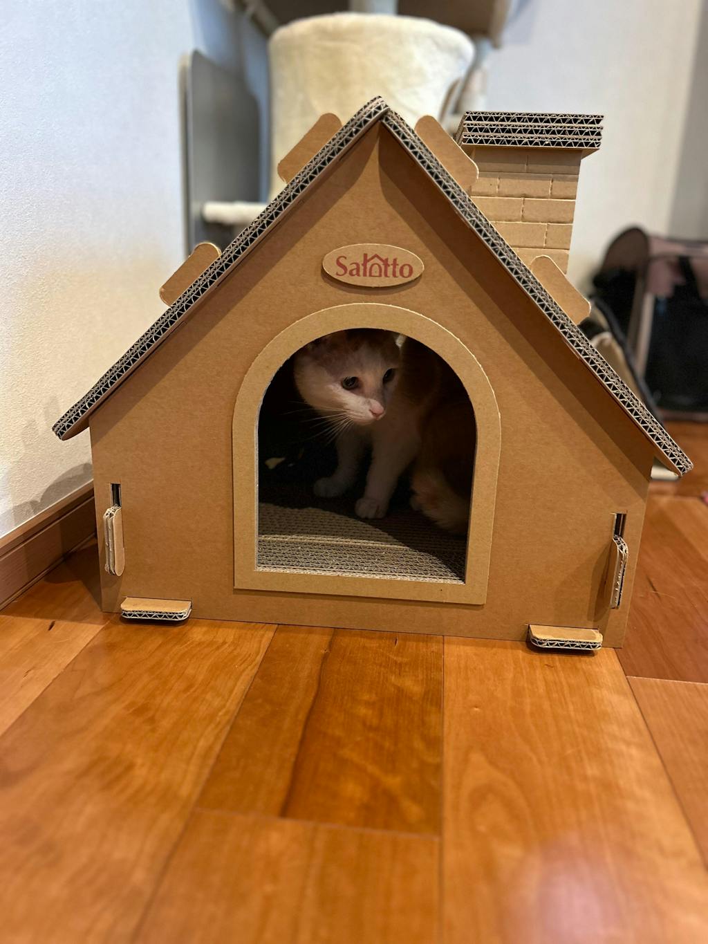 商品を組み立ててすぐに、3匹の猫たちは入れ替わり立ち替わり小屋の中に出入りしていました。大変気に入ったようで、色々なところから手を出して遊んでいます。